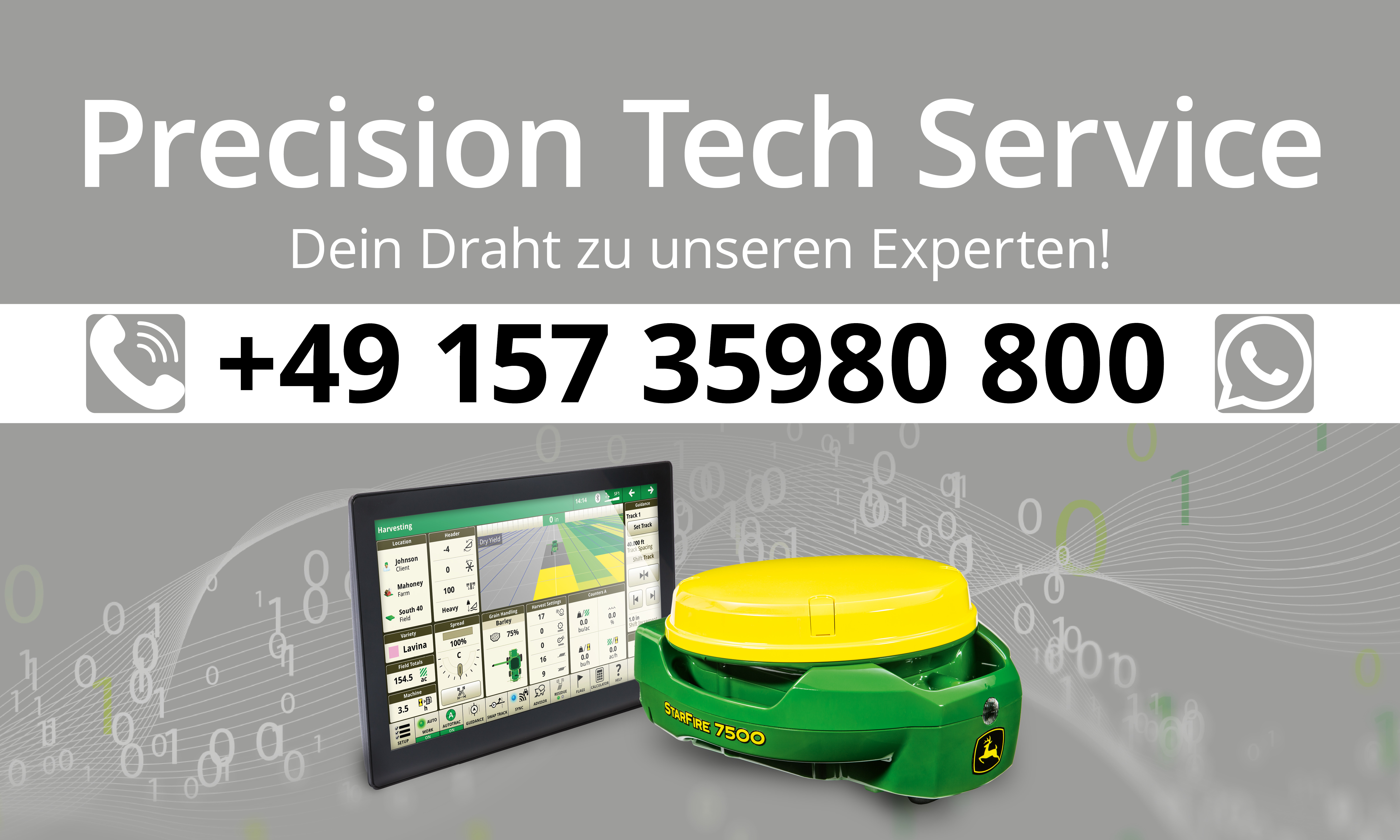 Mitarbeiter mit Tablet vor John Deere Trecker